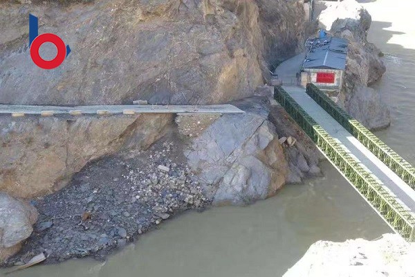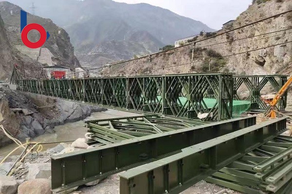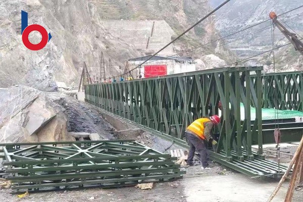 江蘇貝雷鋼橋有限公司派專門的技術人員前往甘肅省甘南藏族自治州迭部縣,架設橋型四排單層加強型(QSR)鋼橋,貝雷鋼橋架設的鋼橋使用200型產(chǎn)品,全橋長45.72米,屬于單跨橋,整個橋面凈寬 4.2米,荷載55噸。
