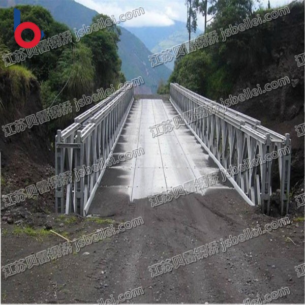 貝雷橋橫梁在橫梁上設置4組夾頭,用來限定縱梁的位置,兩端用短柱連接斜撐,兩端底面各有3個凹槽。在安裝梁時,將凹槽套入析架下弦桿墊板上的栓釘內(nèi),使梁在析架上就位。凹槽與析架之間的間距相同,橫梁就位后,析架之間的間距相對固定。梁架﹔梁架夾由拉桿、懸梁和支撐桿四部分組成;用于固定梁架。支撐桿端部有一個凸頭,安裝時將支撐桿凸頭扣入橫梁墊板凹槽內(nèi),懸梁的一端勾在框架豎桿的長方孔上,然后用支撐桿(或扳手)轉(zhuǎn)動支撐桿使之緊固。大梁夾具無法承受較大的向上荷載,因此,當用夾具夾住大梁時,嚴禁用千斤頂將大梁頂起。